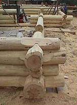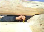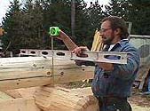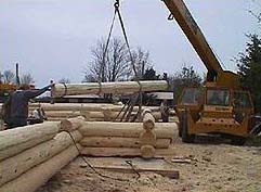 Precise measurements are essential in building a Koski log home. After a log is chosen for a particular spot on a house, rough cuttings and notches are made before it is lifted into place by a crane.